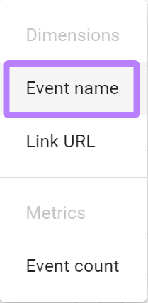 You’ll now search for the two dimensions you need for the link click report. First, search for "Event name" and toggle it on.
